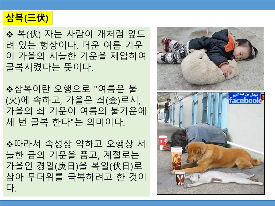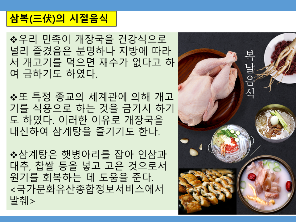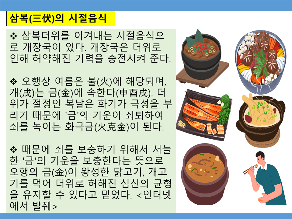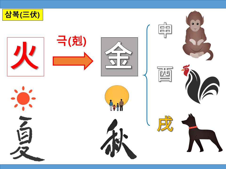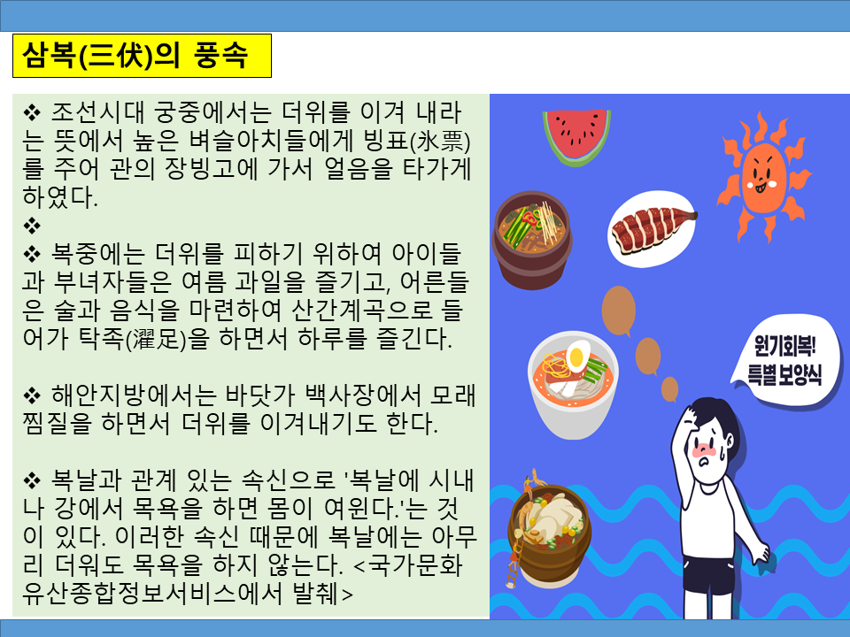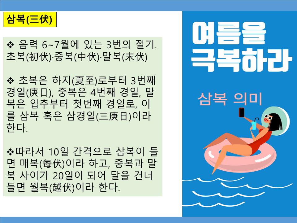 삼복(三伏)이란 일 년 중에서 여름철의 가장 더운 기간을 말하는데 초복(初伏), 중복(中伏), 말복(末伏)을 아울러 이르는 말이다.