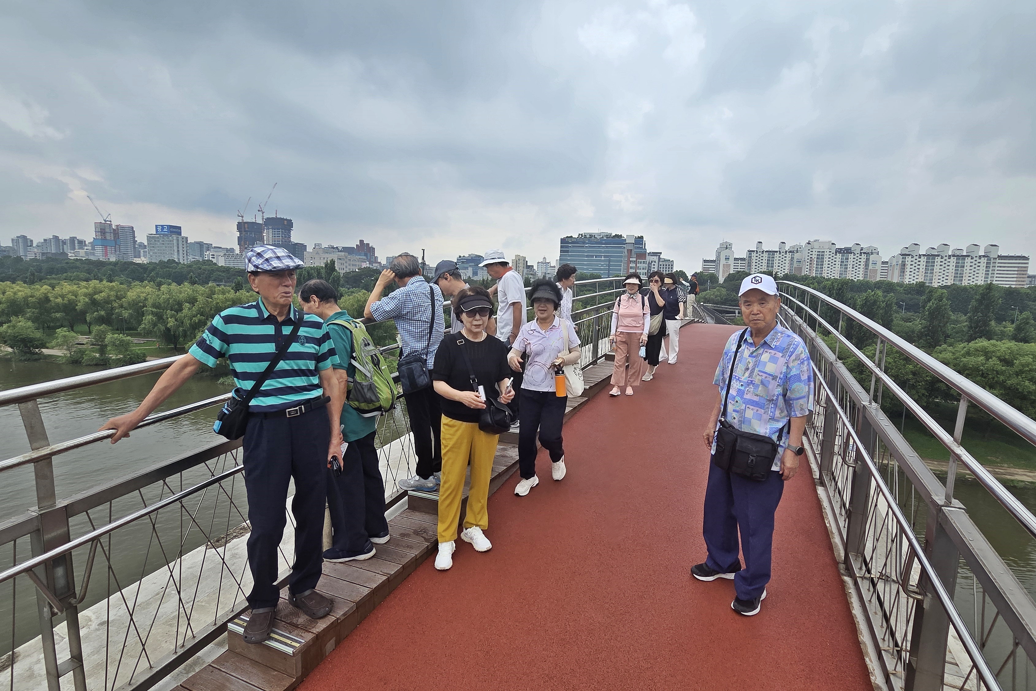 선유도로 이어지는 선유교를 건너면 한강공원과 함께 아름다운 풍경이 펼쳐집니다. 선유교를 건너며 멀리 성산대교가 보입니다. 회원님들이 선유교를 건너고 있습니다. 특히 91세 어르신 두 분께서 노익장을 과시하며 함께 걷는 모습이 인상 깊습니다. 그리고 답사에 참여한 회원분들의 단체 사진입니다. 선유교는 한불수교 100주년을 기념하여 프랑스 건축가 루디 리치오티가 설계한 아름다운 다리로, 이곳에 서면 정신이 번쩍 들 만큼 시원한 한강 바람을 느낄 수 있습니다. 선유도공원의 개장 시간은 오전 6시부터 밤 12시까지이며, 해질녘 선유교에서 바라보는 석양은 특히 아름다워 많은 사람들이 사진을 찍기 위해 찾습니다. 밤이 되면 선유도 곳곳에 조명이 켜지면서 더욱 분위기 있는 데이트 장소가 됩니다.