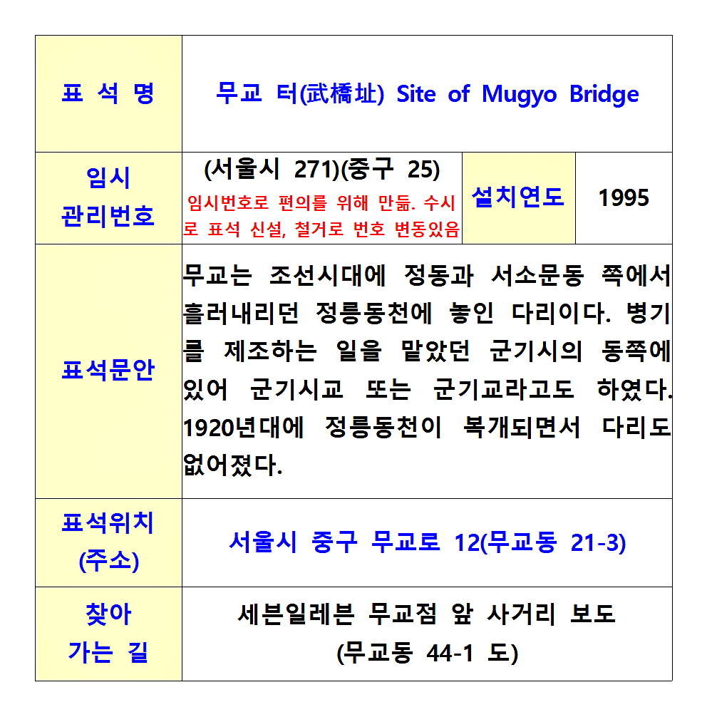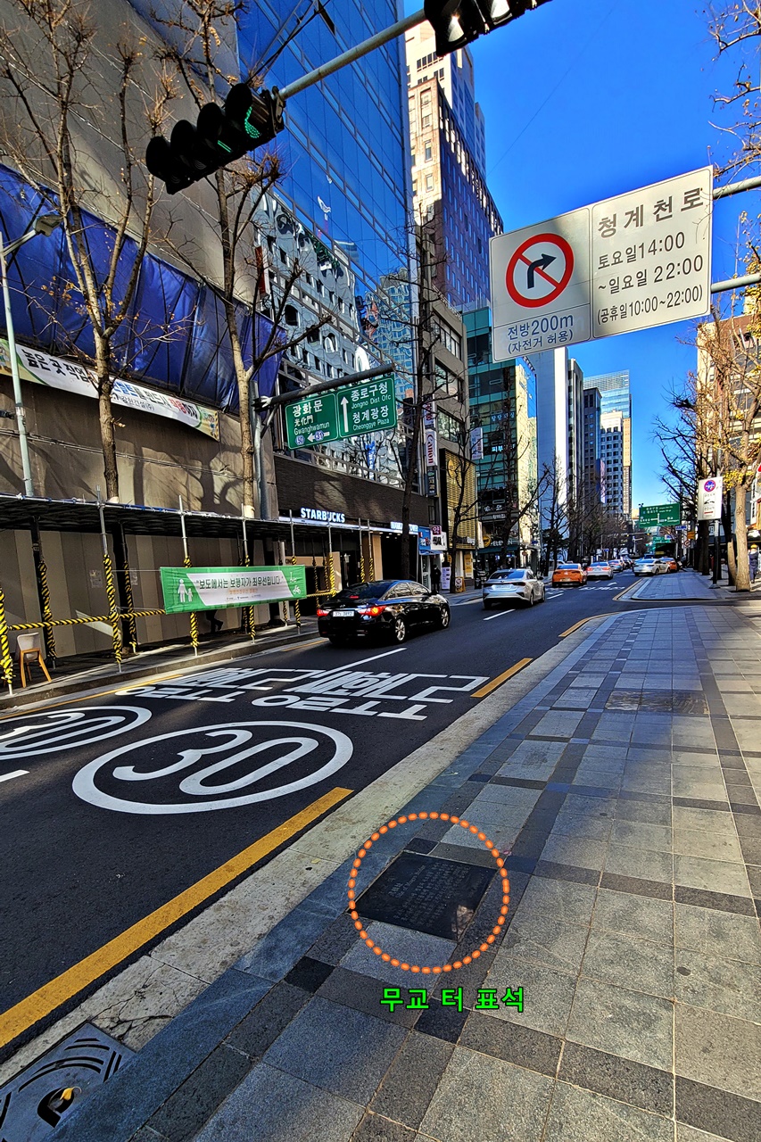 ▼ 옛날 무교 터(武橋址) 표석 위치... 지금보다 30m정도 청계천 방향으로 내려가 있었다.