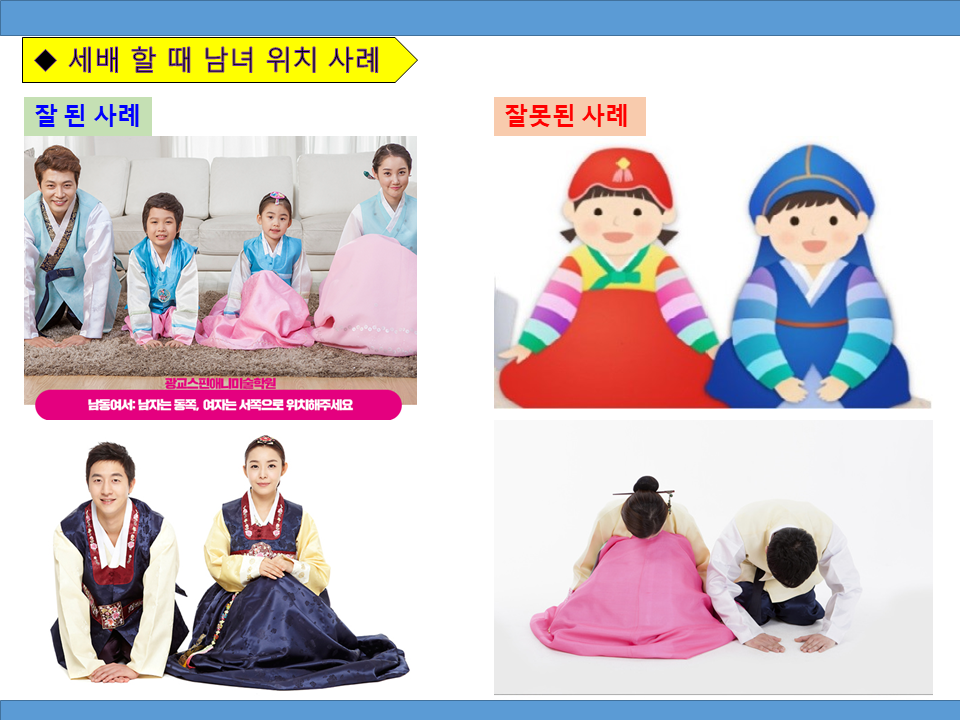 세배할 때, 세배 받을 때 남녀 위치를 그림으로 그려 놓았으니 쉽게 이해하시고 기억을 잘 하셔서 올해부터는 좀 더 품격있게 세배를 해보시기 바랍니다.