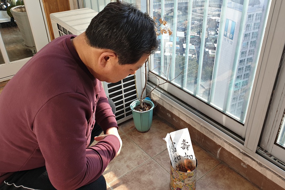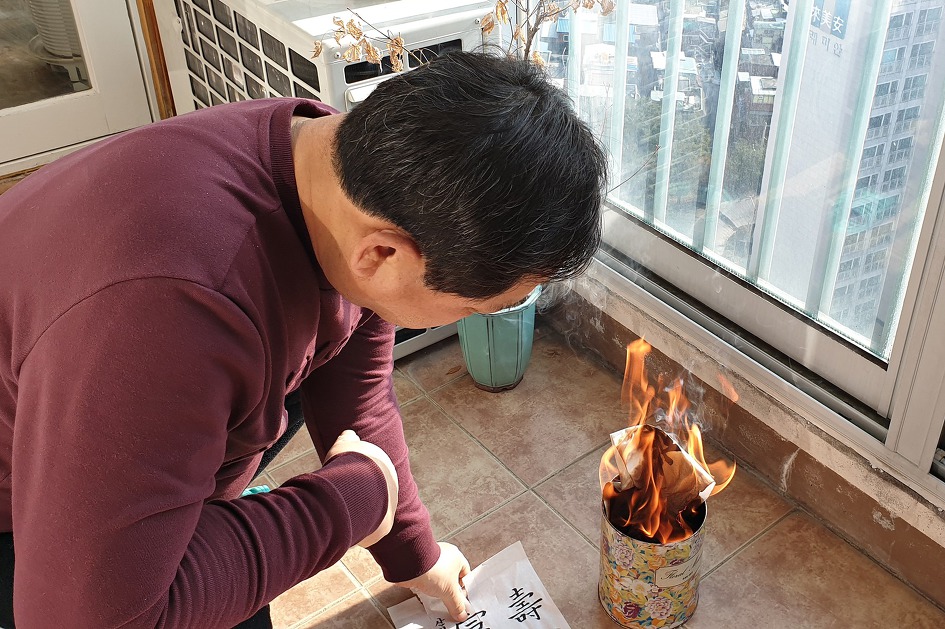 2. 떼어낸 전년도 입춘첩(立春帖)을 조심스럽게 태운다.
