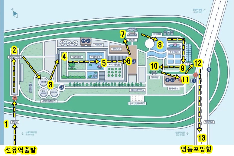 답사장소: 선유도공원 (선유교-선유교전망대-환경정원-시간의정원-수생식물원-녹색기둥정원-이야기관-선유정-환경카페-수질정화원-온실-안내센터)