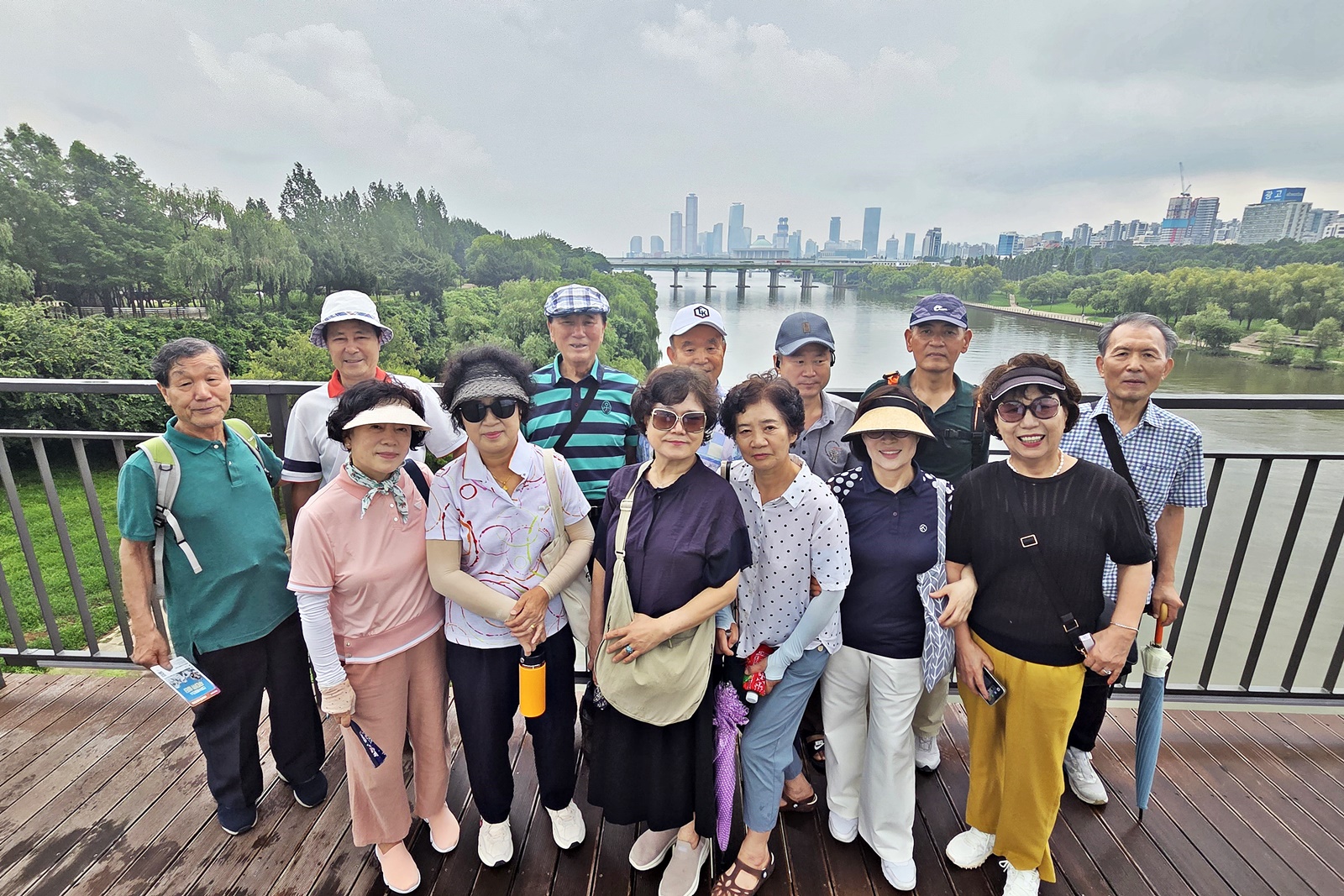 선유도로 이어지는 선유교를 건너면 한강공원과 함께 아름다운 풍경이 펼쳐집니다. 선유교를 건너며 멀리 성산대교가 보입니다. 회원님들이 선유교를 건너고 있습니다. 특히 91세 어르신 두 분께서 노익장을 과시하며 함께 걷는 모습이 인상 깊습니다. 그리고 답사에 참여한 회원분들의 단체 사진입니다. 선유교는 한불수교 100주년을 기념하여 프랑스 건축가 루디 리치오티가 설계한 아름다운 다리로, 이곳에 서면 정신이 번쩍 들 만큼 시원한 한강 바람을 느낄 수 있습니다. 선유도공원의 개장 시간은 오전 6시부터 밤 12시까지이며, 해질녘 선유교에서 바라보는 석양은 특히 아름다워 많은 사람들이 사진을 찍기 위해 찾습니다. 밤이 되면 선유도 곳곳에 조명이 켜지면서 더욱 분위기 있는 데이트 장소가 됩니다.