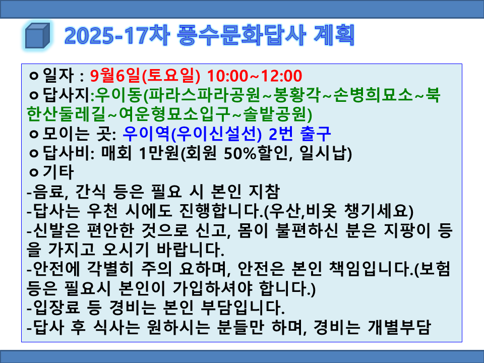 ▼ 다음 답사는 9월6일 우이동 답사합니다.(연락처: 야초 010-5475-6529)