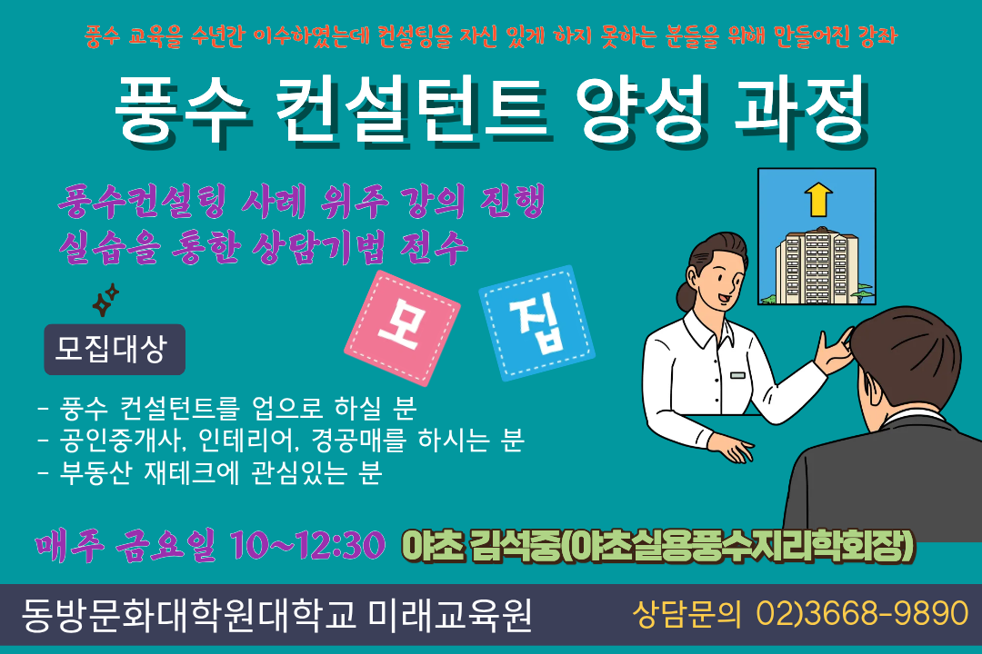 | (동방대 미래교육원)2025년 가을학기 풍수 컨설턴트 양성 과정 모집 (0) | 2025.08.19 |