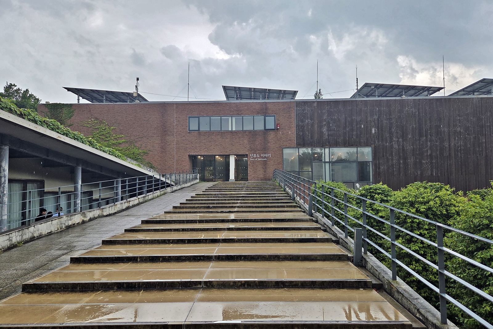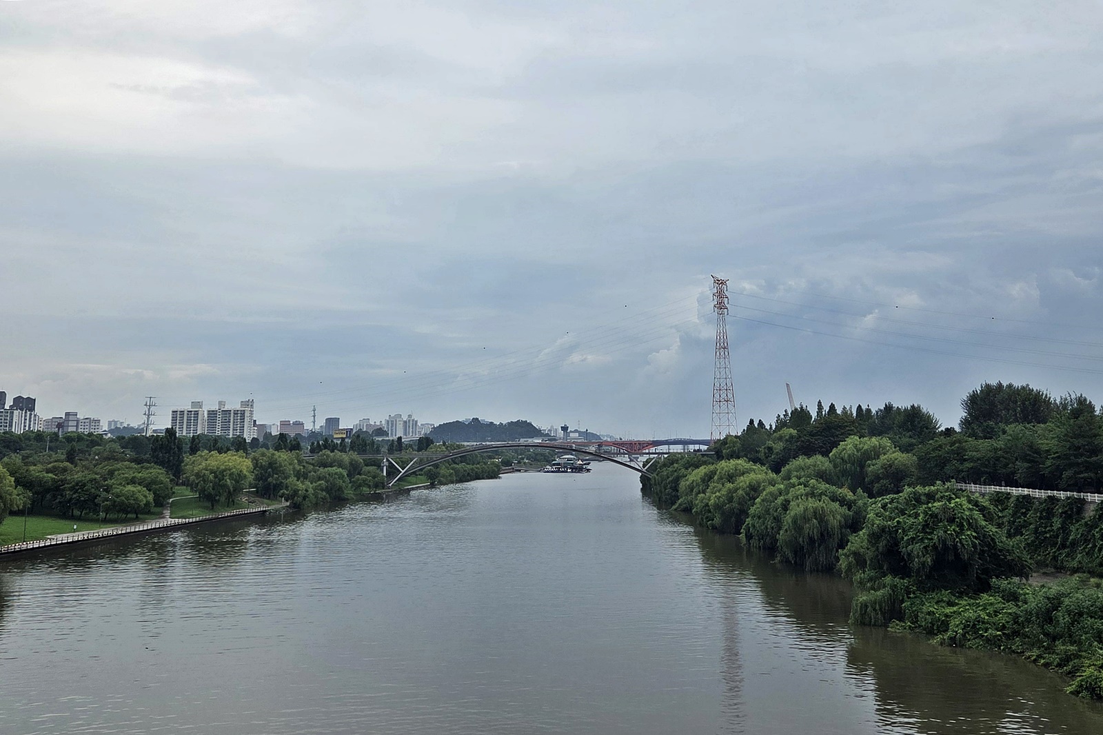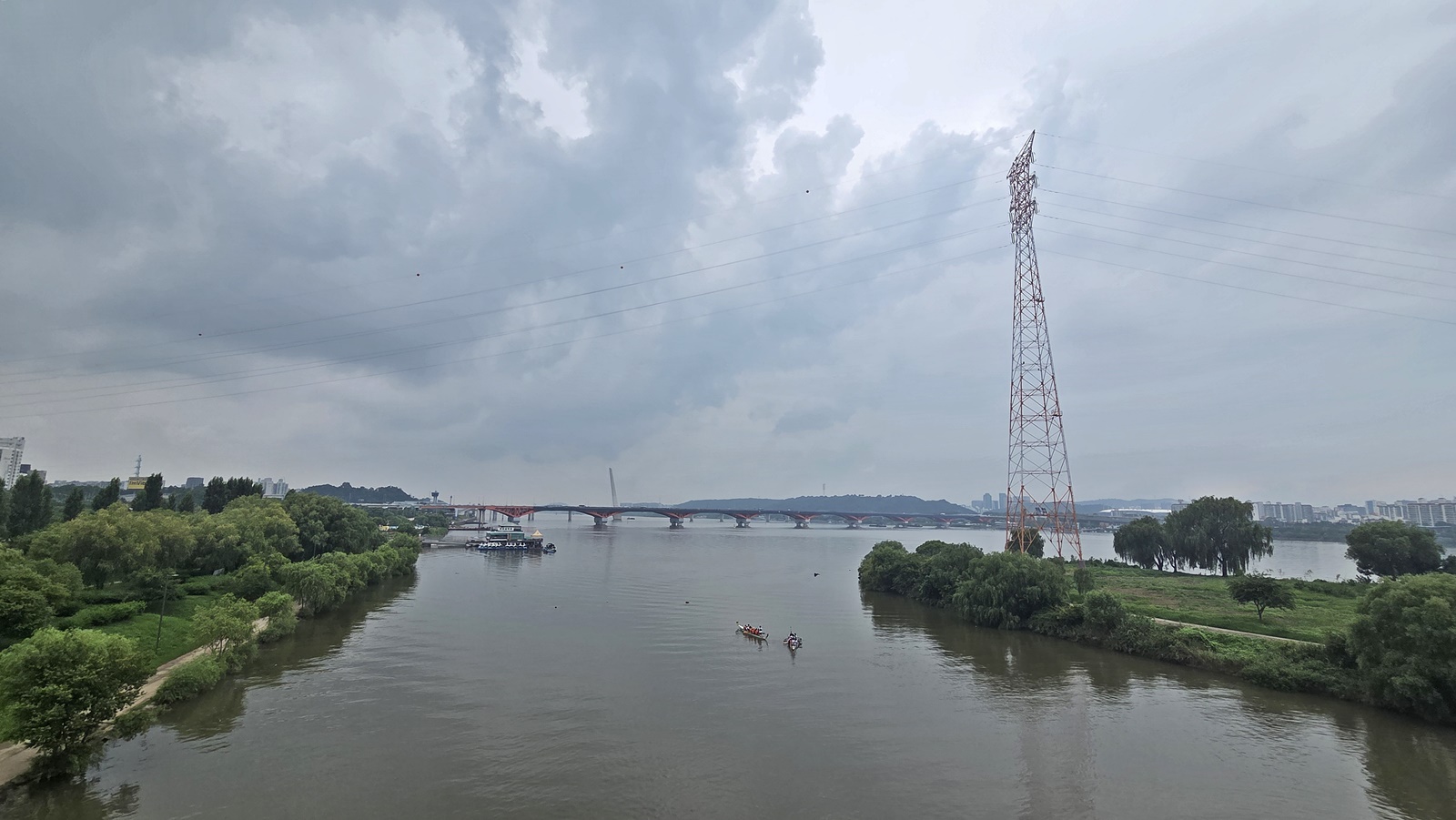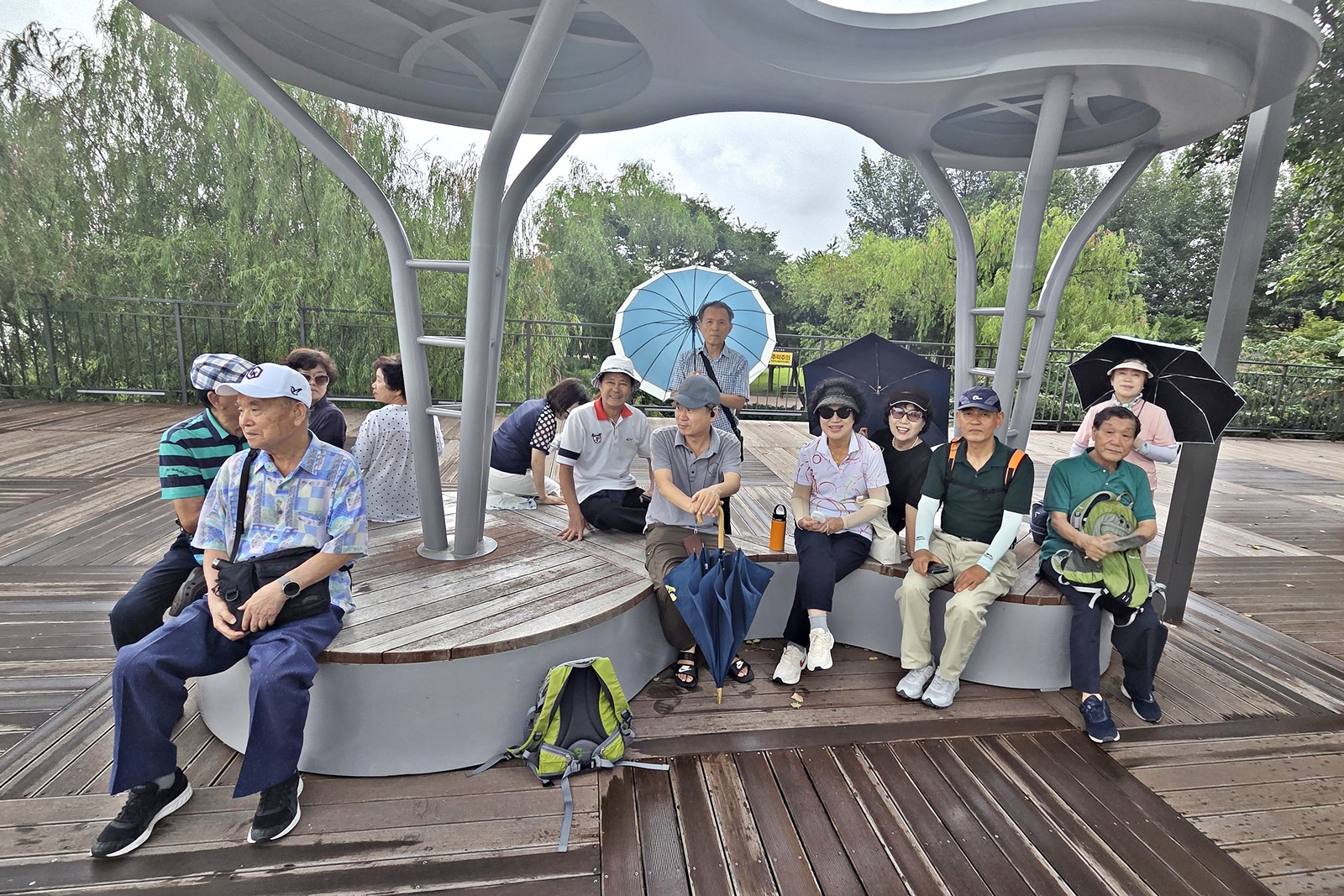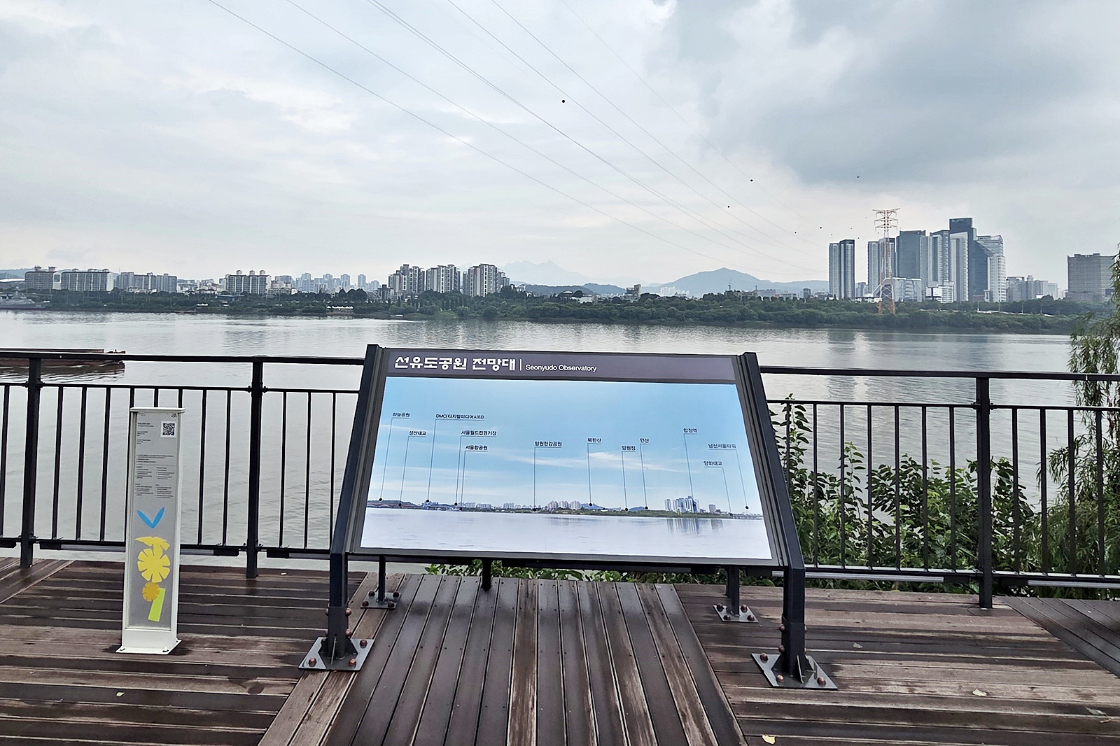 선유도 전망대에서는 선유도공원과 선유교가 만나는 부분에 조성된 공간에서 여의도, 일산대교, 성산대교, 월드컵공원, 북한산 등 서울의 탁 트인 전망을 조망할 수 있습니다. 강 건너 안산이 보입니다. 비가 오락가락하더니 본격적으로 내리기 시작하여 잠시 비를 피하고 있습니다. 벤치가 있어 휴식을 취하며 한강 풍경을 감상하기에도 좋습니다.