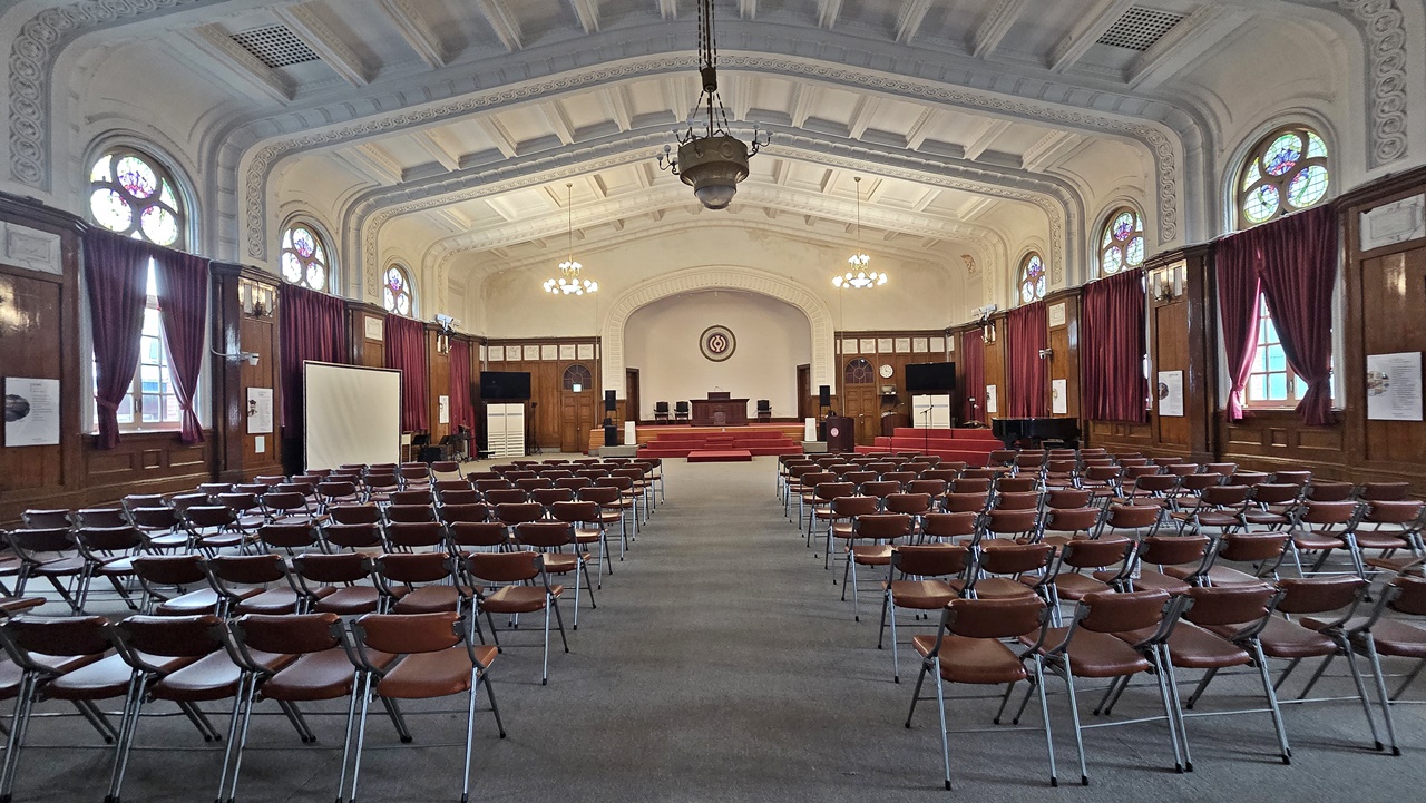 건물 내부로 들어서자 웅장한 강당이 눈앞에 펼쳐졌습니다.